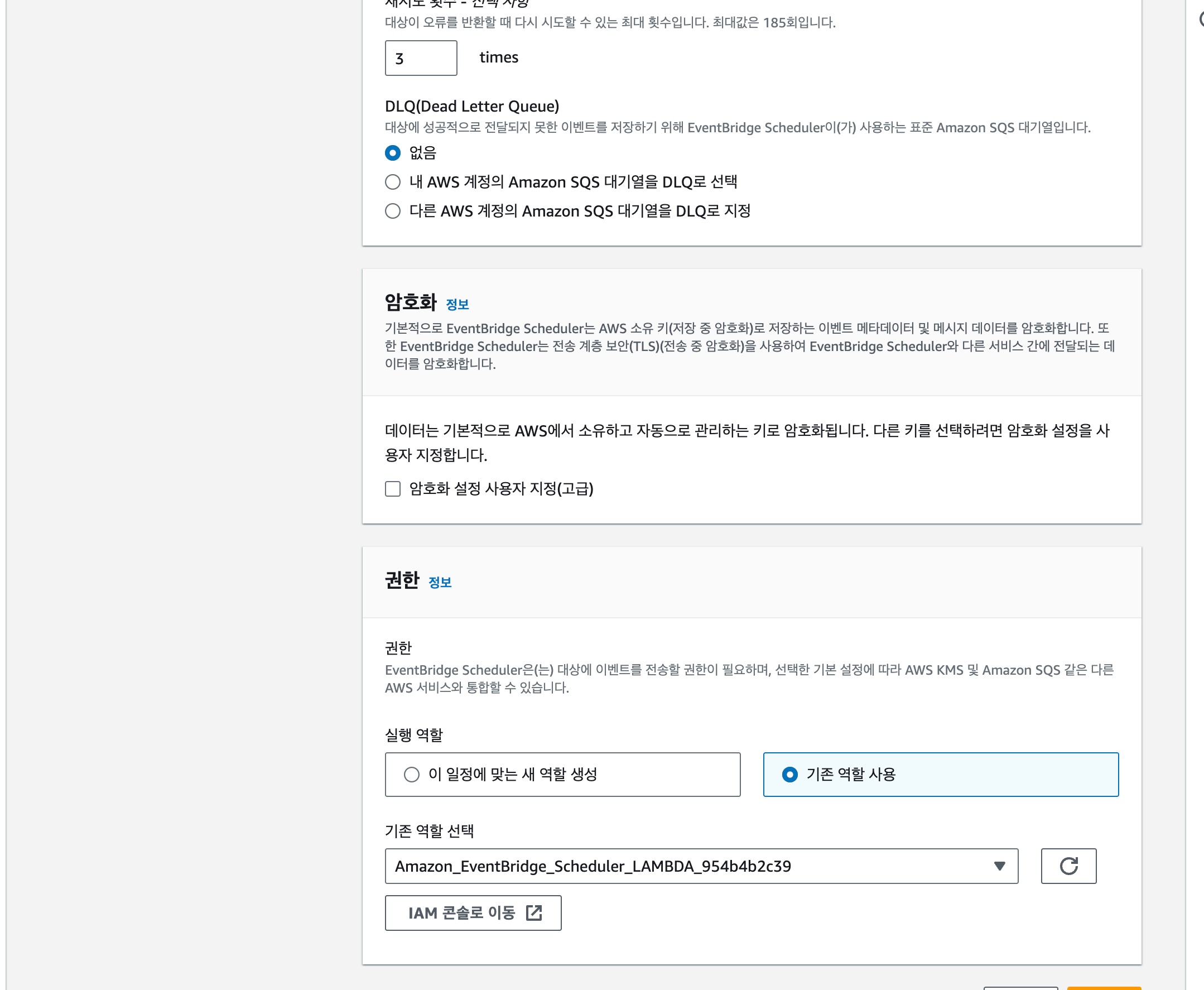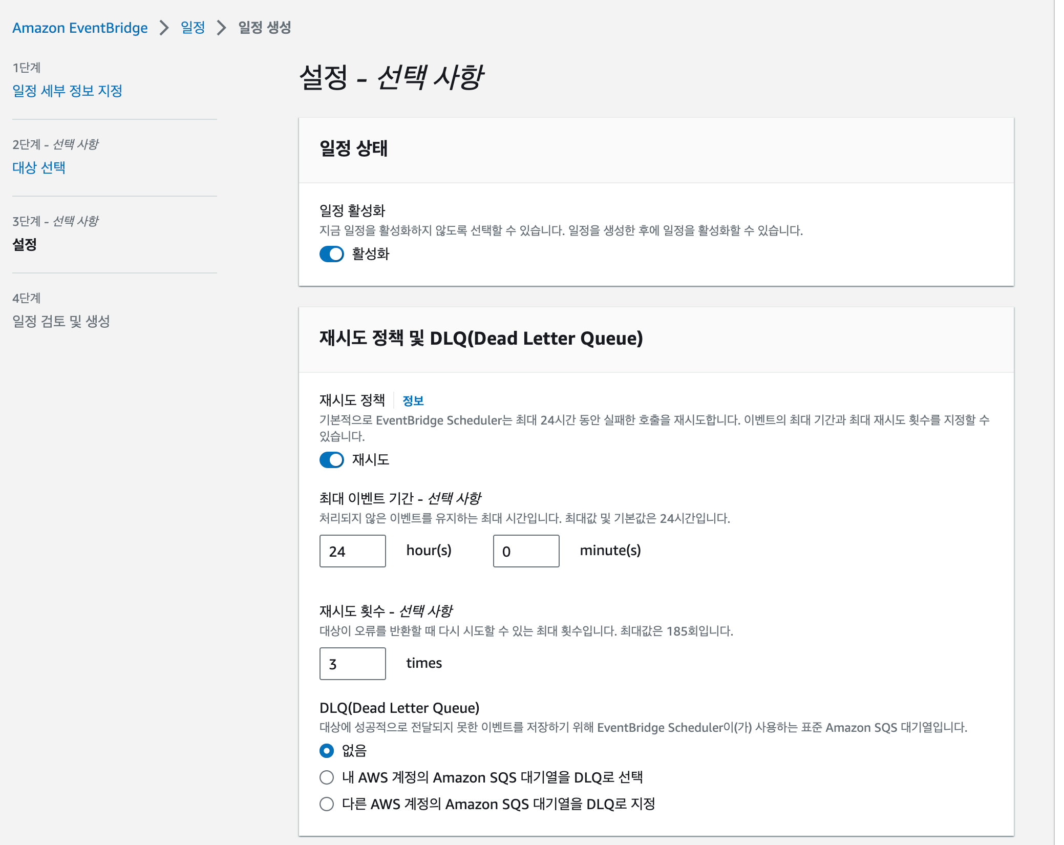 Lambda 함수를 스케줄러가 실행했는데 정상적으로 완료가 안될 수도 있습니다. 이럴 때를 대비해 재시도 정책을 설정할 수 있는데요.