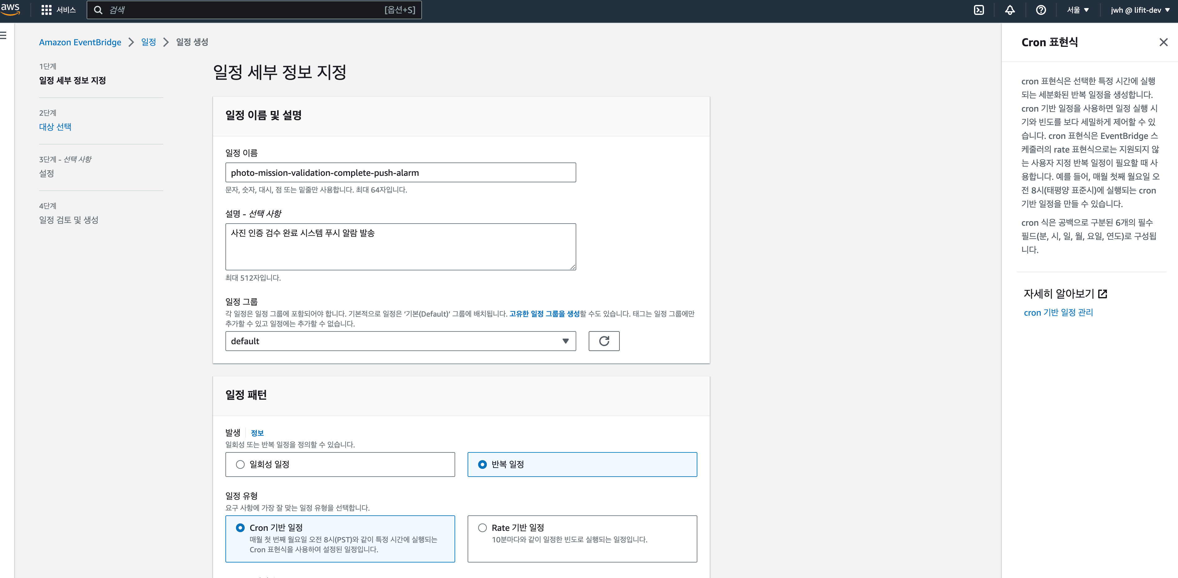 반복된 일정으로 선택하면 유형을 선택할 수 있는데요. Cron기반이나 Rate(주기) 기반으로 설정할 수 있습니다.