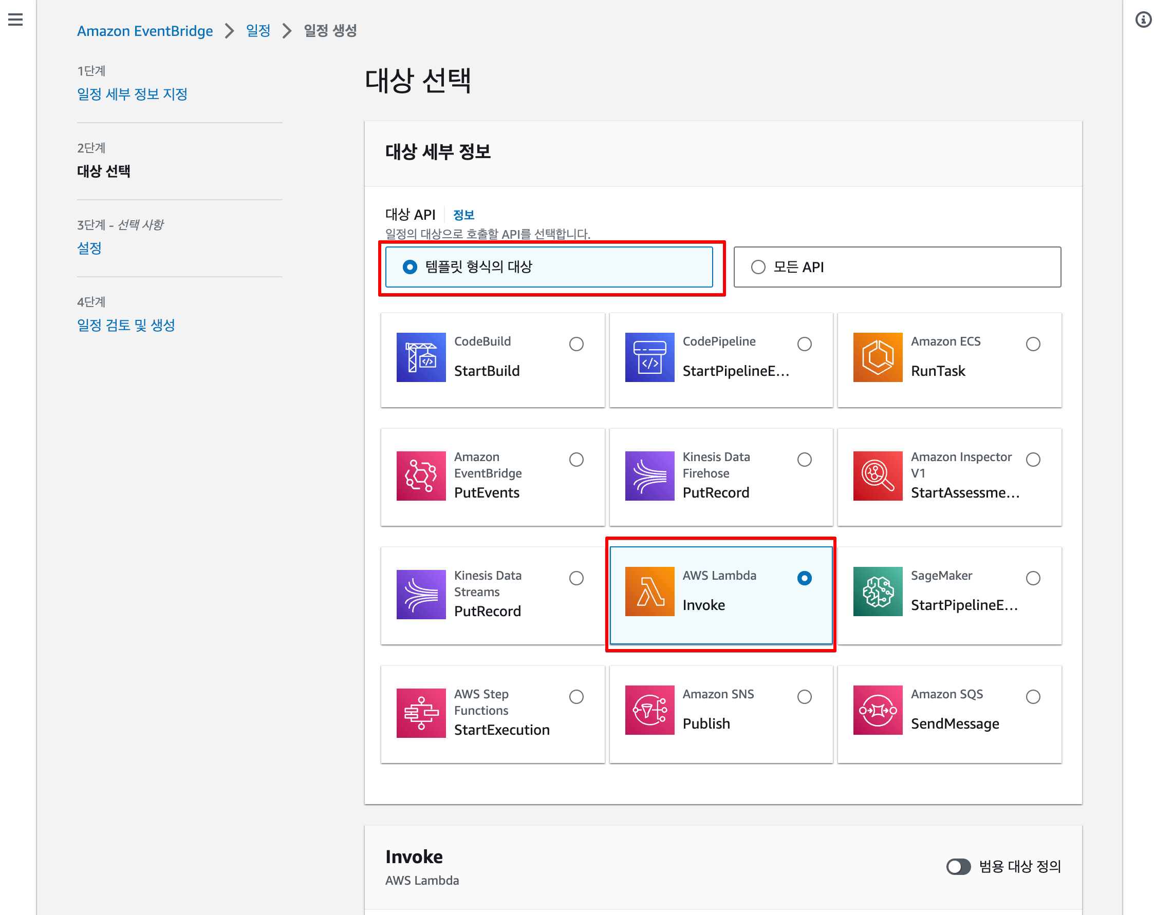 이제 실행할 대상을 선택합니다. 템플릿 형식의 대상에서 AWS Lambda Invoke를 선택합니다. 스케줄러가 Lambda 함수를 실행시켜 줍니다.