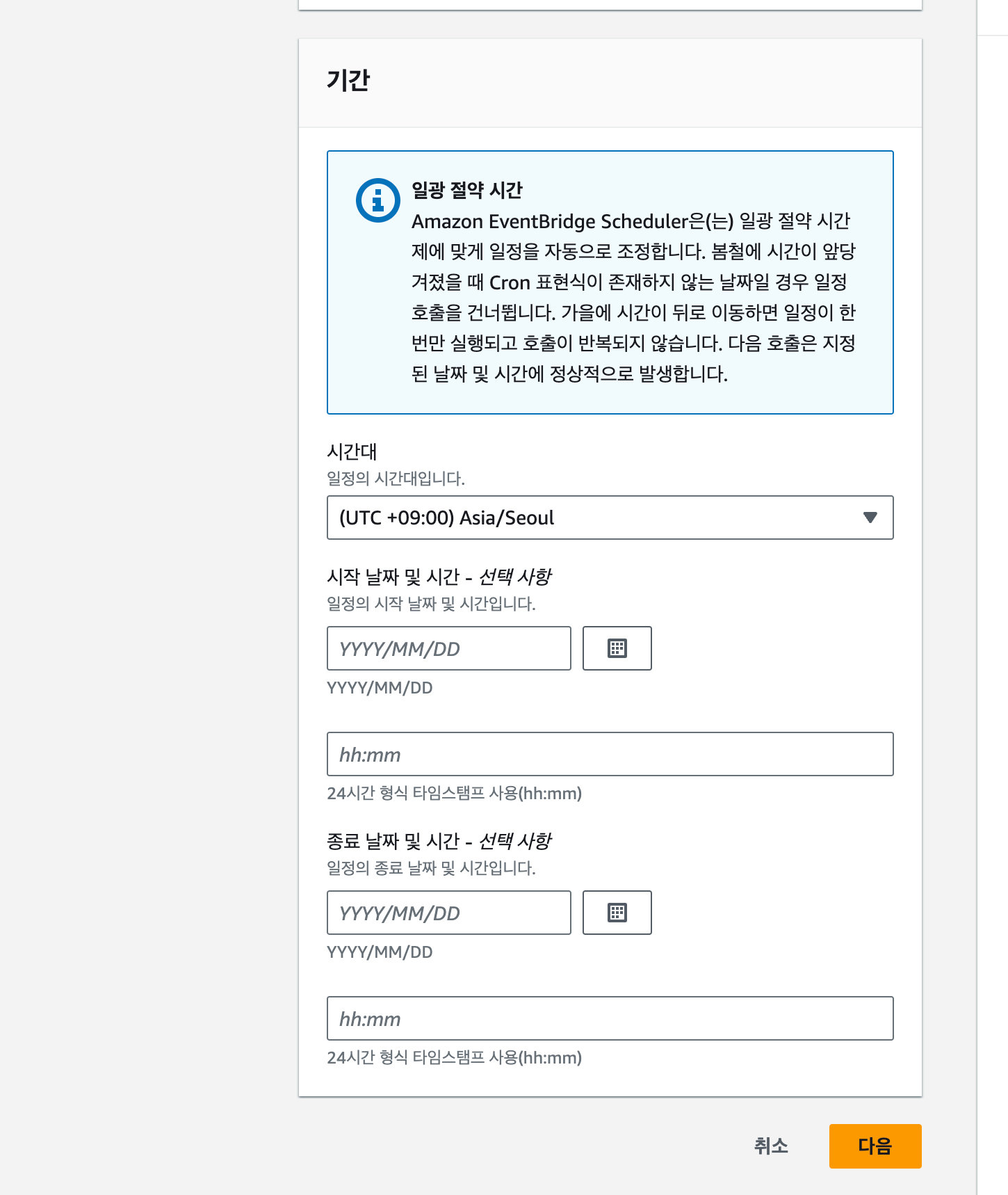 스케줄러에 등록할 때 기간도 설정할 수 있습니다. 주기적으로 반복되는 일이지만 특정 기간만 사용하고 싶을 때(예를 들어, 이벤트 기간 동안 주기적으로 통계를 집계하는 람다함수를 실행한다던지)에 설정하면 됩니다.